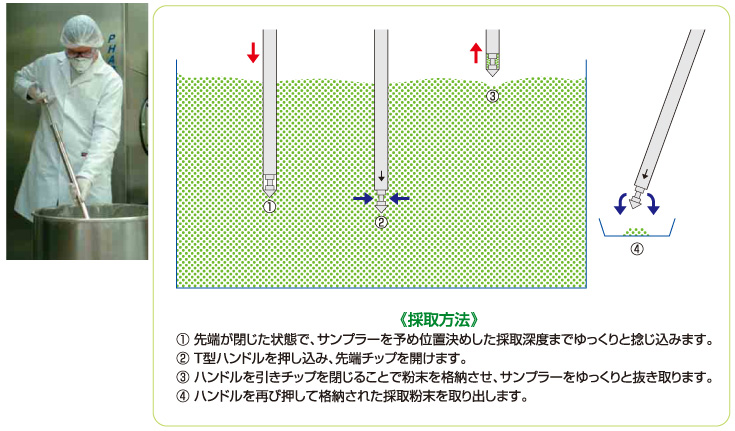 ・T型ハンドルの押し引きで袋、ドラム缶や樽等から粉末を外気に曝さず簡単・迅速に採取するサンプラーです。