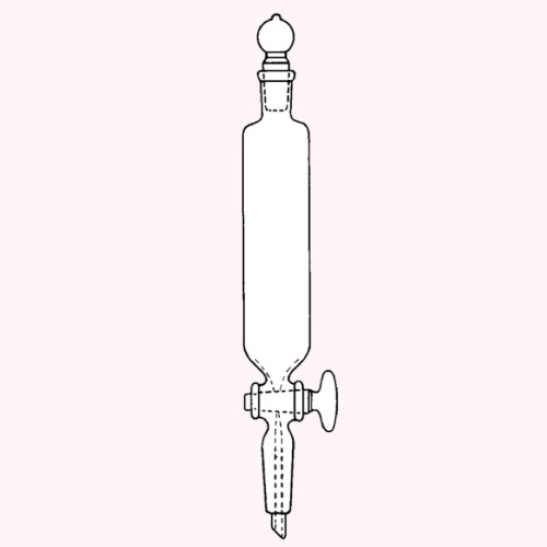 ガラスコックの付いた円筒形のCTE-33製分液ロートです。2種類の溶媒への溶解度の差を利用して混合物を分離する際に使用します。排出部は透明摺合せになっています。