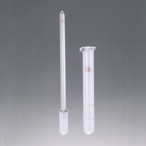 動植物組織などを粉砕します。試料を入れる筒とこれと摺り合わせになった乳棒に相当するピストンから構成されています。様々な形状のものがありますが、これはポッター・エルビーエム・ホモジナイザーと呼ばれるタイプです。ガラスのいぼが付いていないタイプなので、いぼ付きに比べてより細かな粉砕が可能です。筒・乳棒共にCTE-33製です